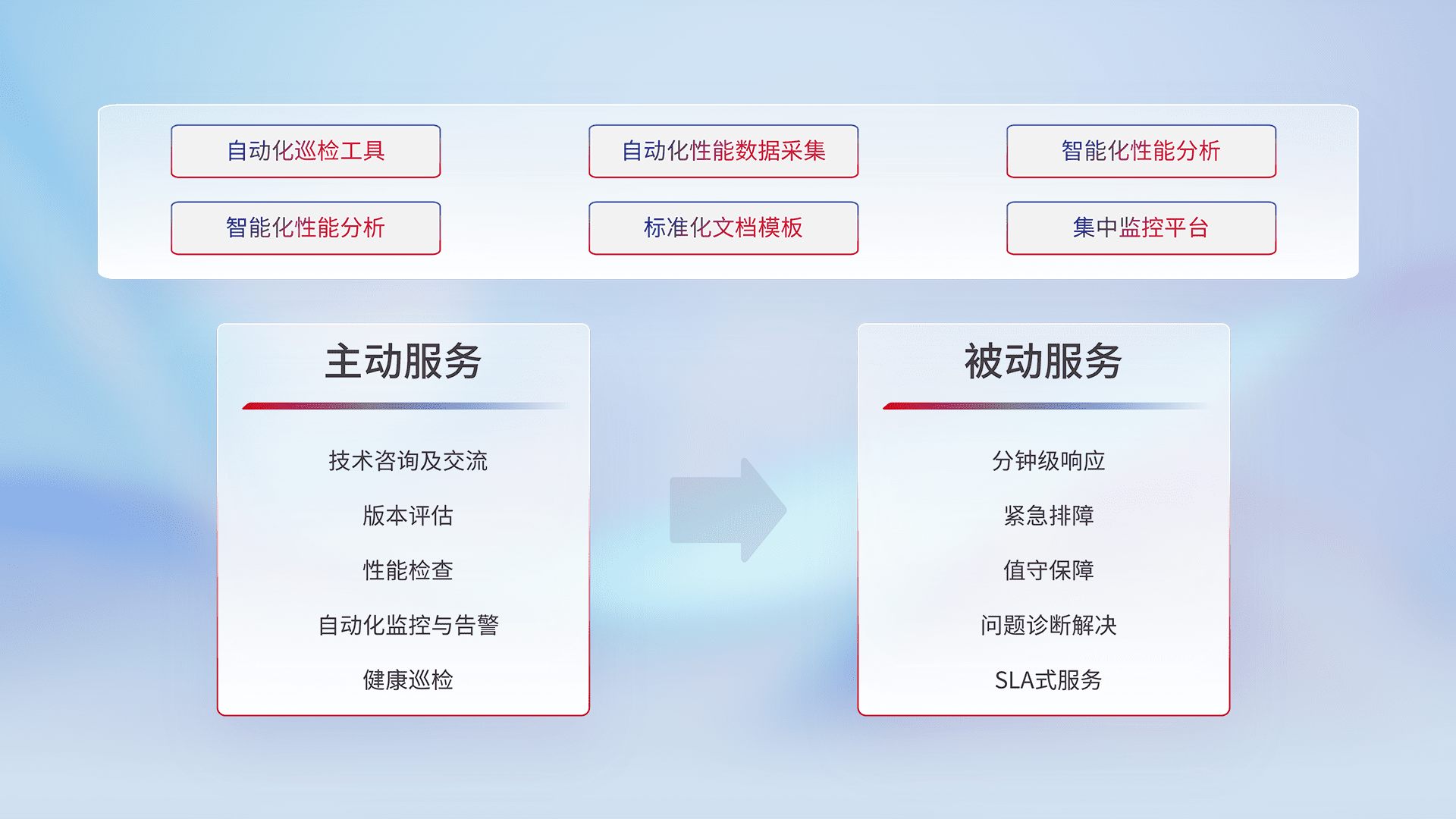 智能化工具和标准化文档,,,保障服务质量,,提供主动服务(包含技术咨询、、版本评估、、、性能检查、、、自动化监控与告警、、、、健康巡检)和被动服务包含(分钟级响应、、、、紧急排障、、、值守保障、、、问题诊断解决、、SLA服务)。。