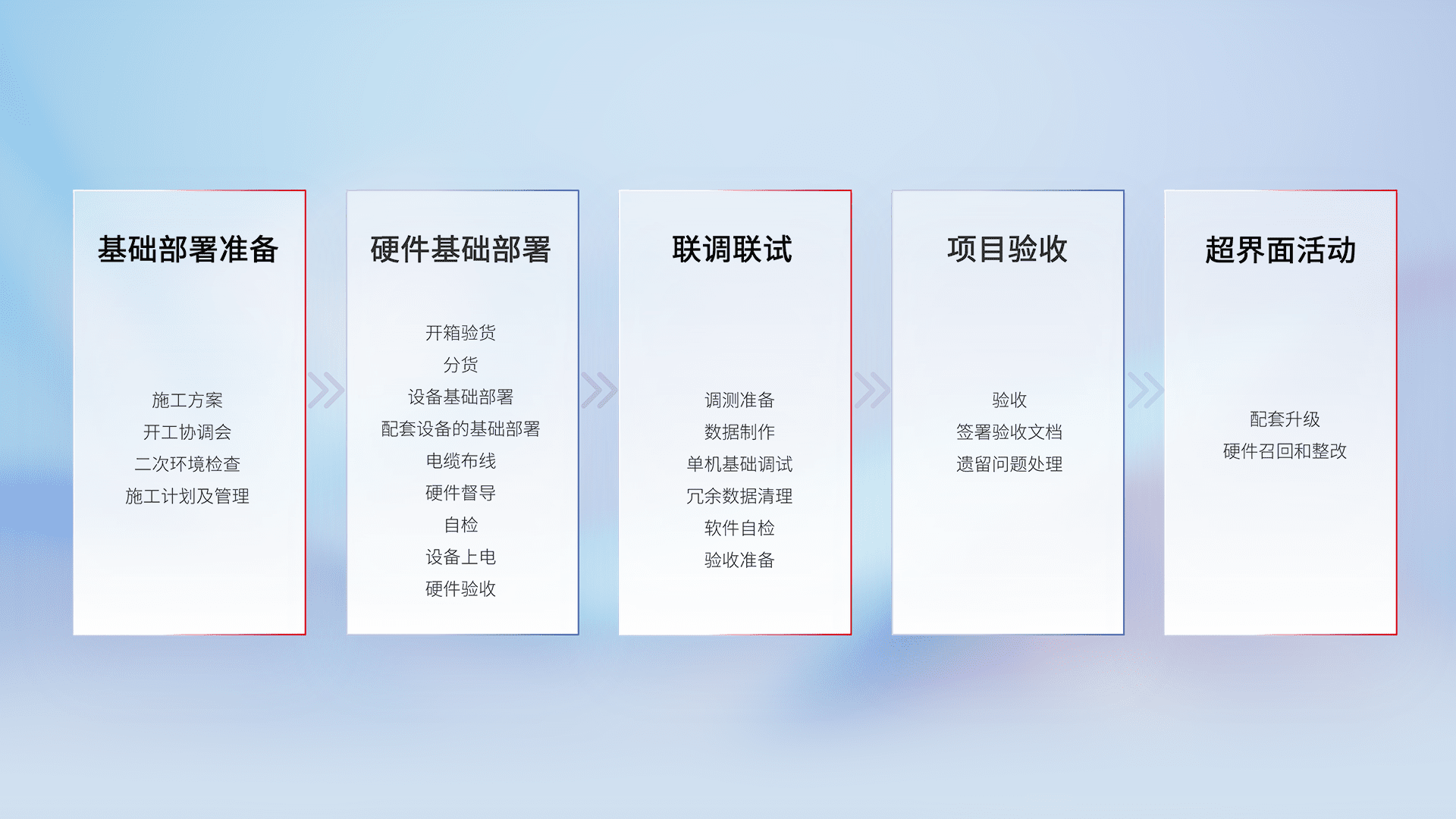 从基础部署准备、、、硬件基础部署、、、、联调联试、、、、项目验收、、越界面活动的全过程可追溯,,,,保证施工质量和进度。。